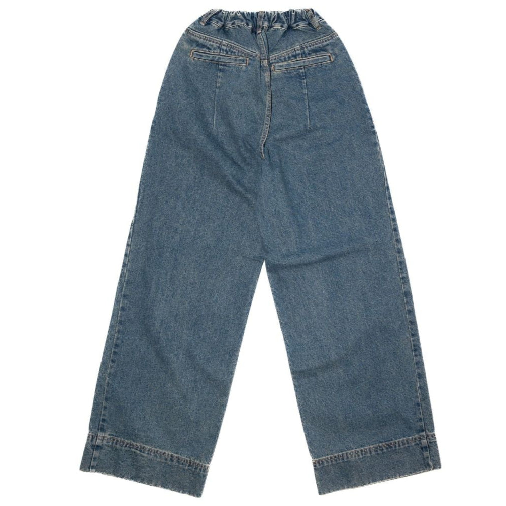 Estudio Niksen's Big Hem Denim Jeans feature a larger hem for styling. Embroidered logo at back pocket and custom trimmings. Elastic band at back. Wide fit.