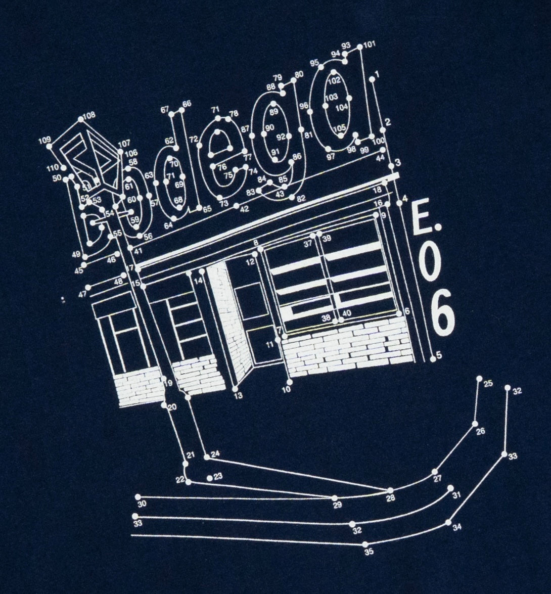 A tribute to the roots that built us. Featuring a connect-the-dots graphic of our original Boston storefront - a blueprint of where it all began. Part nostalgia trip, part streetwear puzzle, the design brings back the corner that helped shape Bodega's story. Even though the shop's doors are closed, the outline remains - ready to be traced by anyone who remembers or wants to know where it started
