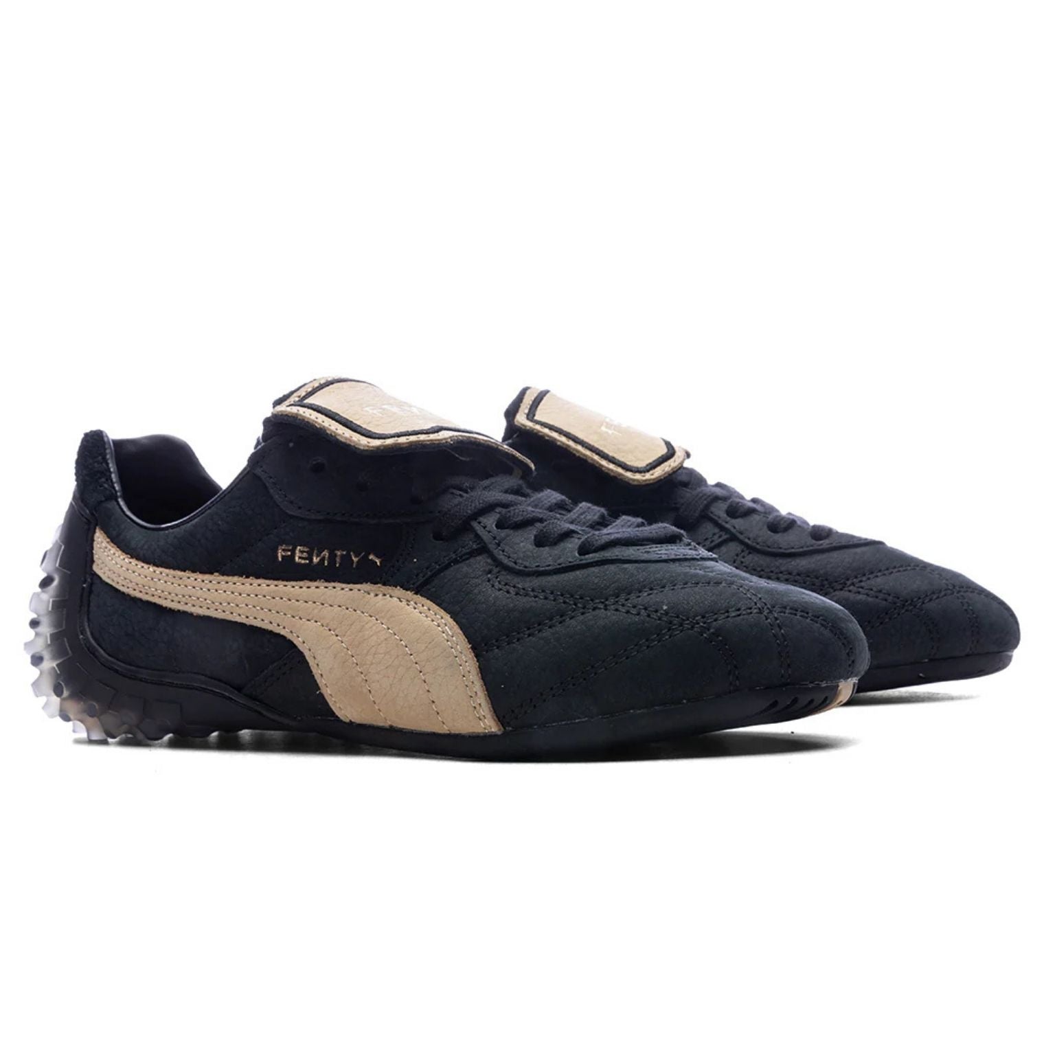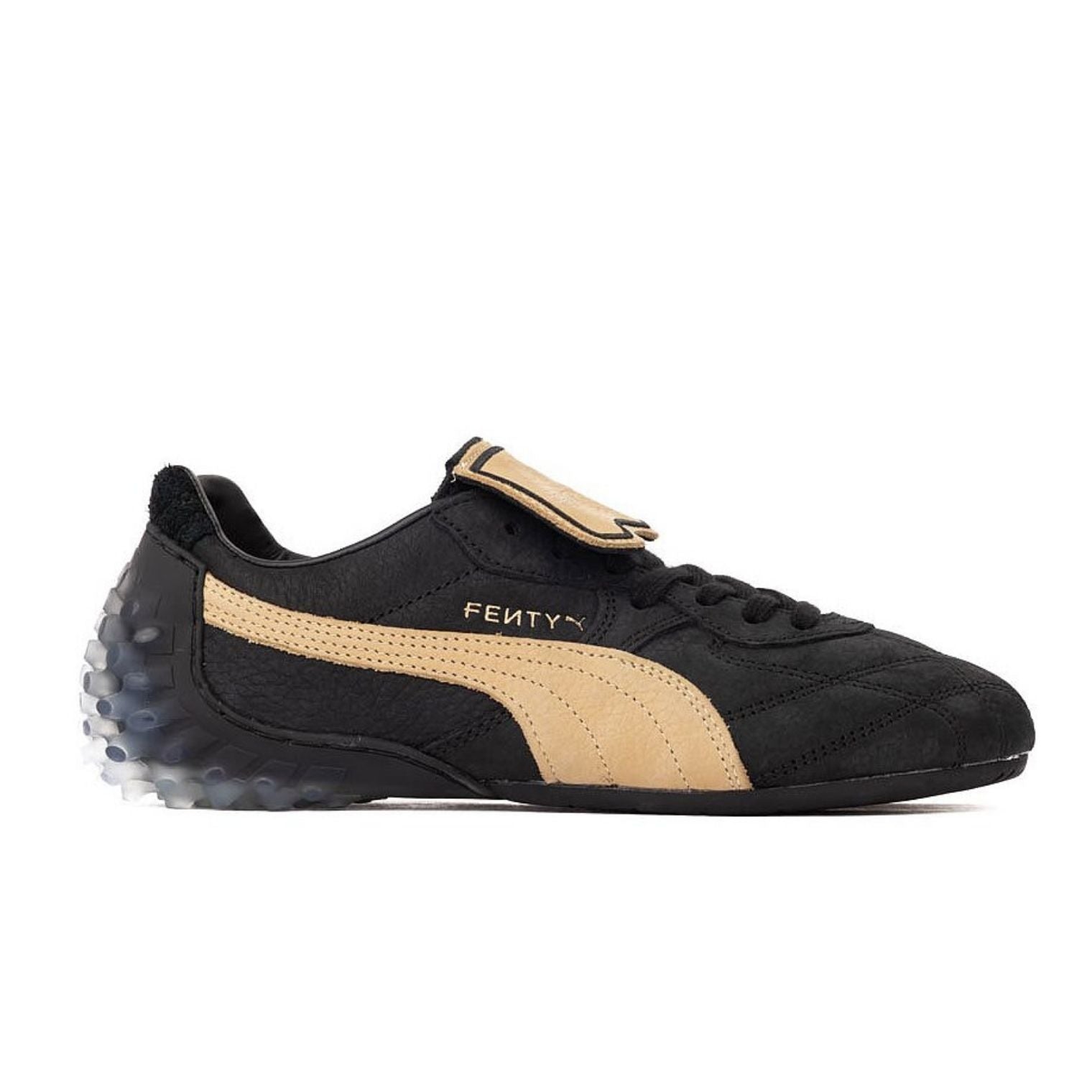 The Avanti is here to play. The FENTY x PUMA classic returns in black and beige, featuring classic football-inspired stitching, a fold-over tongue, and a translucent TPU heel with a subtle ghosting effect.